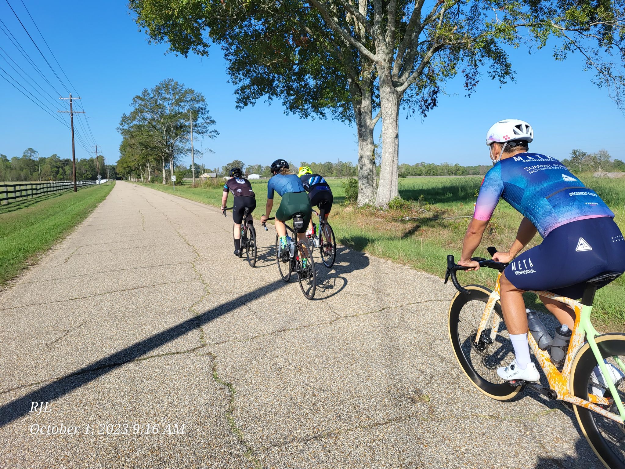 Last weekend I ventured up to Madison Mississippi for the Spooky Cross cyclocross races. This is a fairly low-key event designed as much for Rolando's flock of young kids as it is for the grownups (I use the term loosely since, you know, ... cyclists). With the combined "A" and "B" races not starting until 10:30, I didn't need to leave New Orleans until 6:30 or so, even taking into account that I-55 north from LaPlace to Ponchatoula was still closed from the horrendous superfog-caused crash almost a week earlier in which over 100 cars were involved and seven people were killed. Instead of taking the old two-lane highway 51, I took the Causeway to I-12, and then to I-55, all of which went quite smoothly at that time of the morning. Of course, I arrived way earlier than I really needed to. The weather for the weekend was clear and warm, and was probably one of the last such weekends we'll see this fall. I would be riding my Blue Norcross bike with its classic rim brakes and well-worn tires, neither of which I thought would matter much since I had no plans whatsoever of pushing my luck on this up-and-down course. My not-insignificant criterium skills do nothing but get me in trouble in a cyclocross race, and the fact that I have virtually no mountain bike or, for that matter, "gravel" skills doesn't help either. So the plan for me was to start near the back, lock up my rear wheel on every downhill, creep around the sharp turns, and power up the climbs, assuming I could remember how to shift the mechanical SRAM derailleur. At any rate, it would be a nice change of pace, and even though I'd be riding very conservatively, I knew I'd get a decent amount of intensity for 45 or 50 minutes.